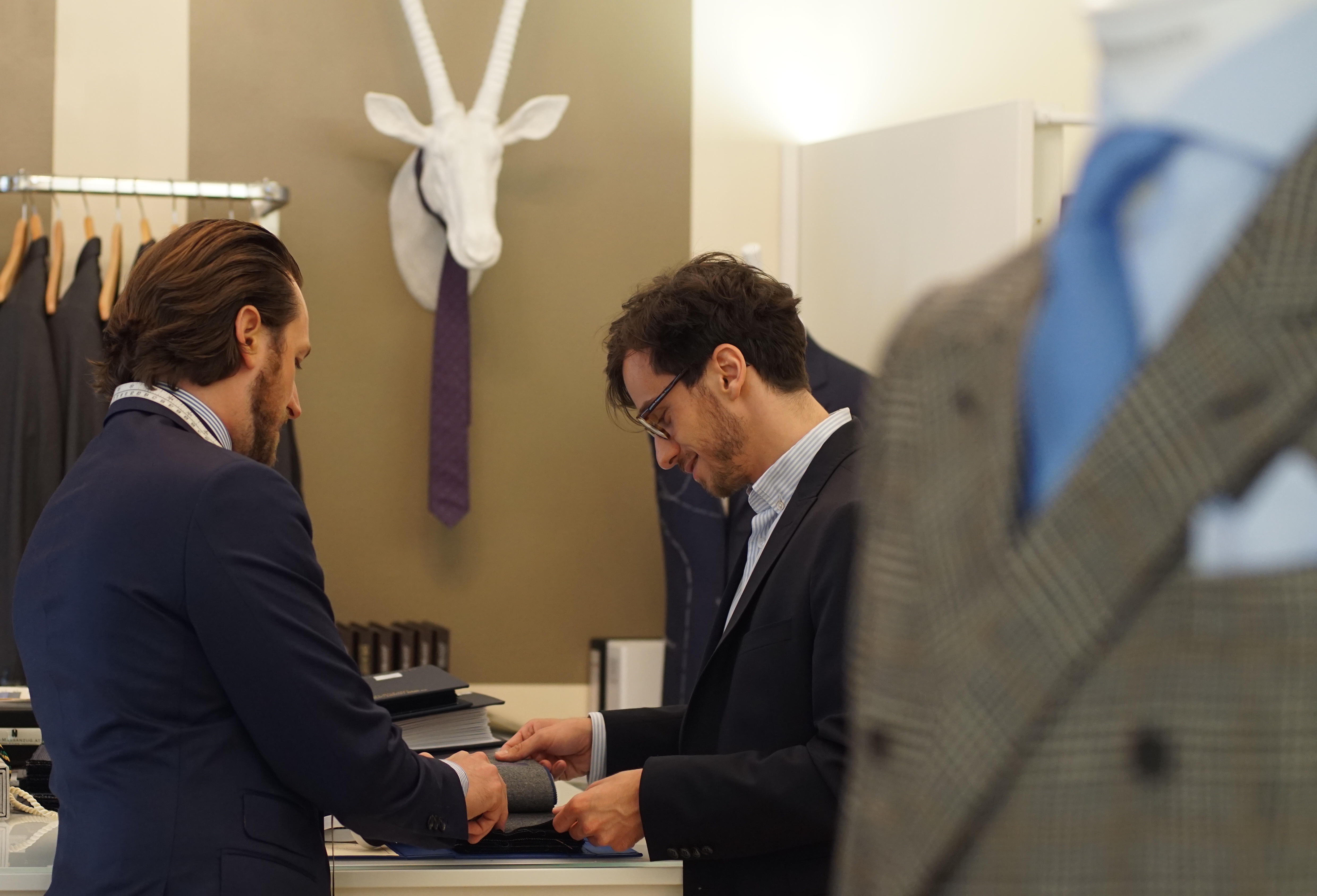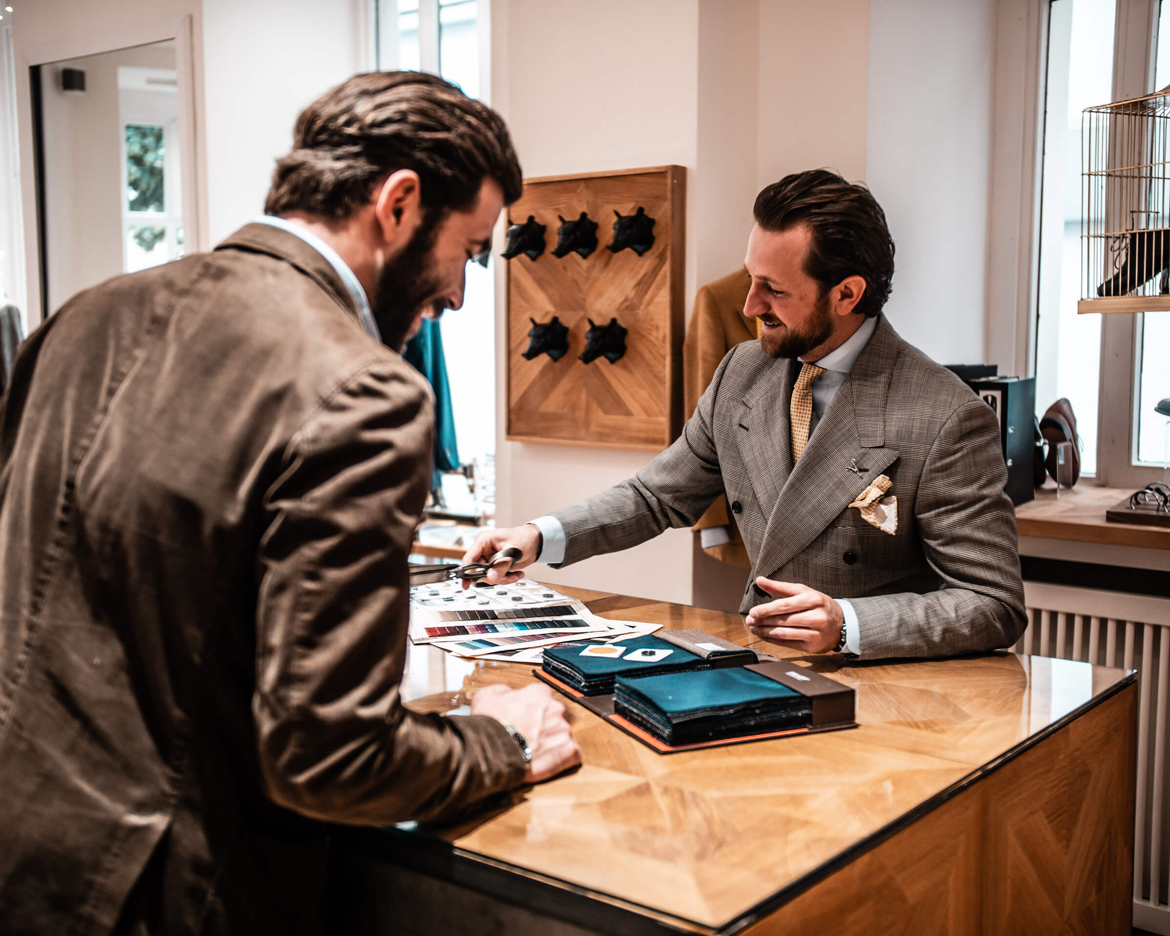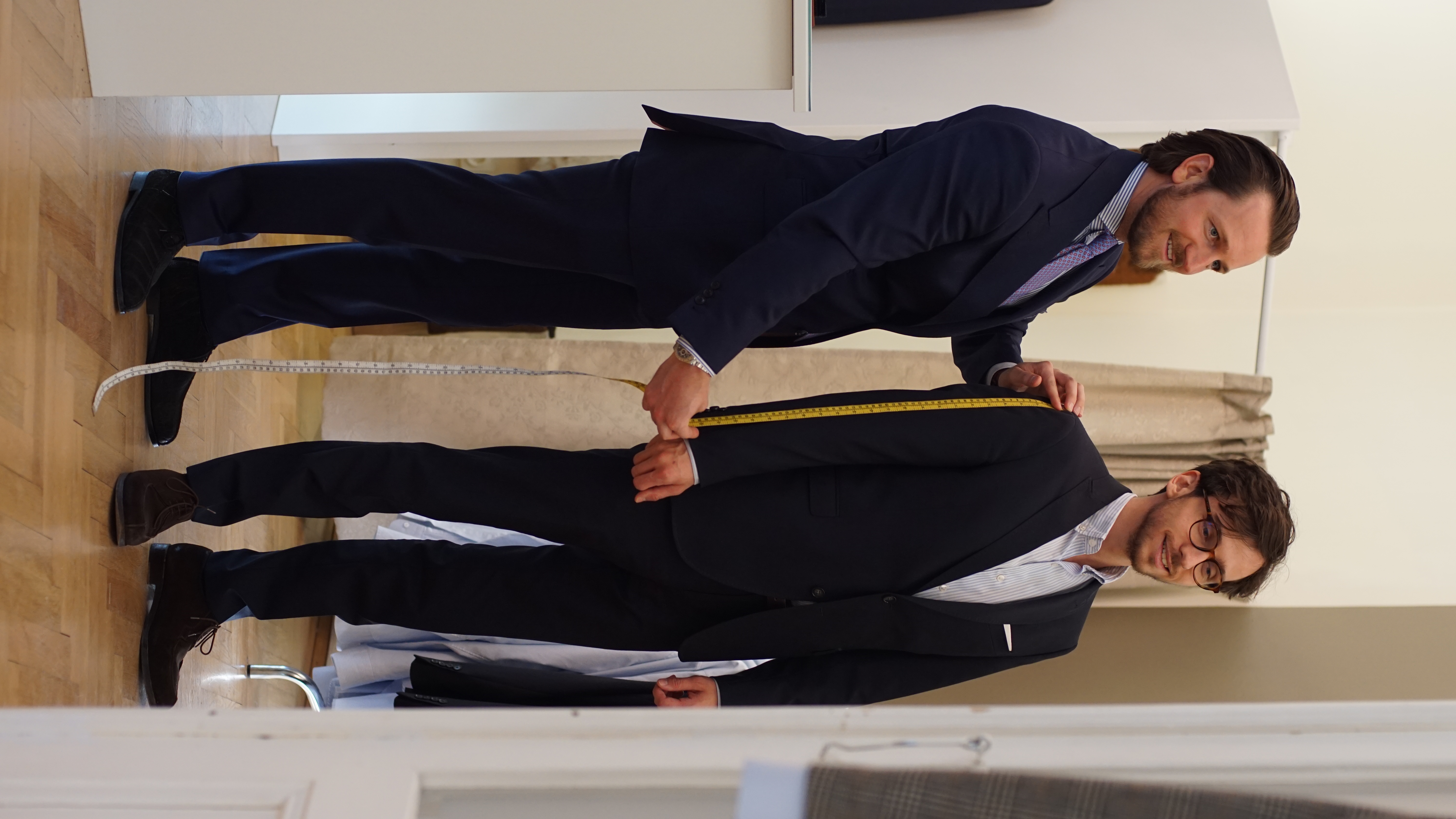 Wählen Sie aus über 400 exklusiven Baumwollstoffen sowie einer einzigartigen Auswahl an Kragen- und Manschettenformen. Mit einem Monogramm unterstreichen Sie Ihre Individualität. Der persönliche Maßtermin mit unserem Schneidermeister ist eine ebenso einzigartige Erfahrung wie das Maßhemd, das dabei entsteht. Vom Schnittmuster bis zur Fertigstellung Ihres ersten Hemdes vergehen rund zwei Wochen.